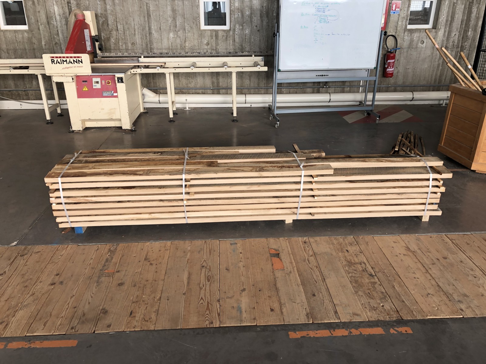 La collaboration avec l’École Supérieure du Bois se poursuit : Milena prend en charge la quantification du stock et accompagne le séchage des pièces. Des groupes d’étudiant·e·s évaluent les possibilités de réaliser une structure porteuse avec les éléments disponibles, en réalisant des prototypes.