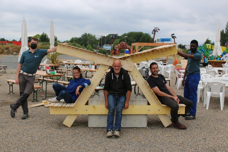 Pour la deuxième saison d’ouverture du site de Transfert, l’équipe de PickUp Production a sollicité tout terrain pour l’animation d’un atelier de construction de mobilier autour des bloc de béton empilables qui sécurisent le site.