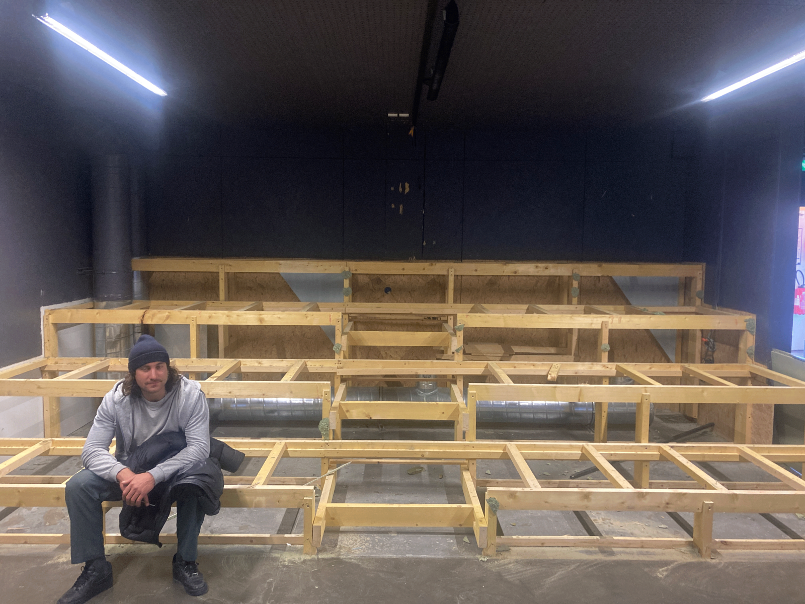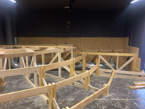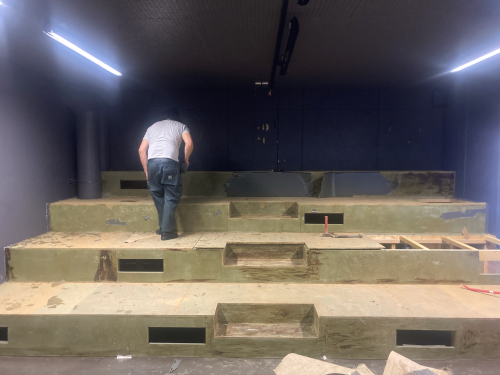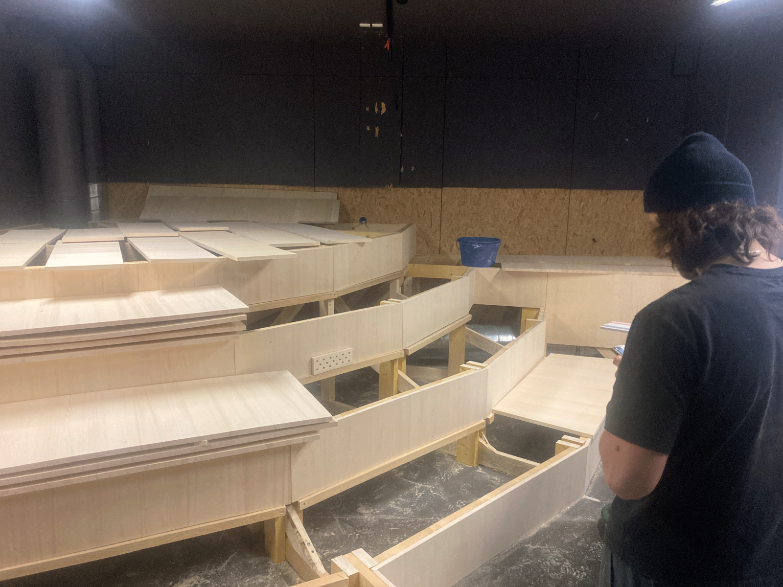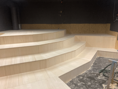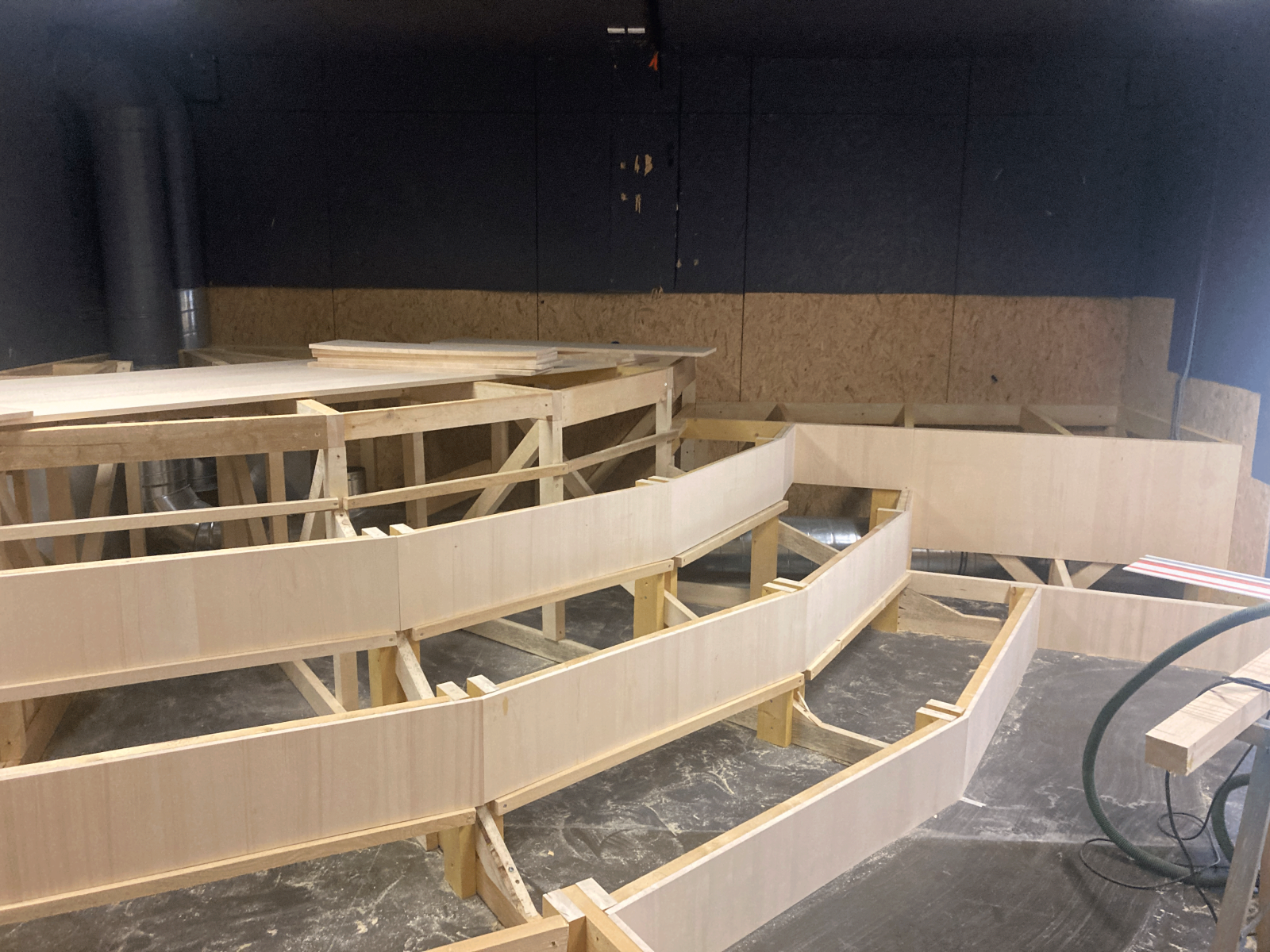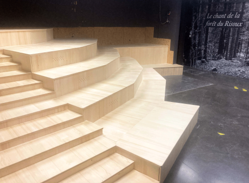 De nombreux aléas ont mis à mal le projet, qui a finalement réussi à se concrétiser à l’été 2023, grâce aux entreprises Assemblage (menuiserie ébénisterie) et Vidélio (installation multimédia) et aux incroyables fournisseurs qui ont joué le jeu des matériaux (très) locaux : la Scierie Perrin à Longchaumois - qui a fourni les pièces de la structure du gradin et l'entreprise Ravier à Domblans qui a réalisé des panneaux sur-mesure avec des résineux du Risoux.