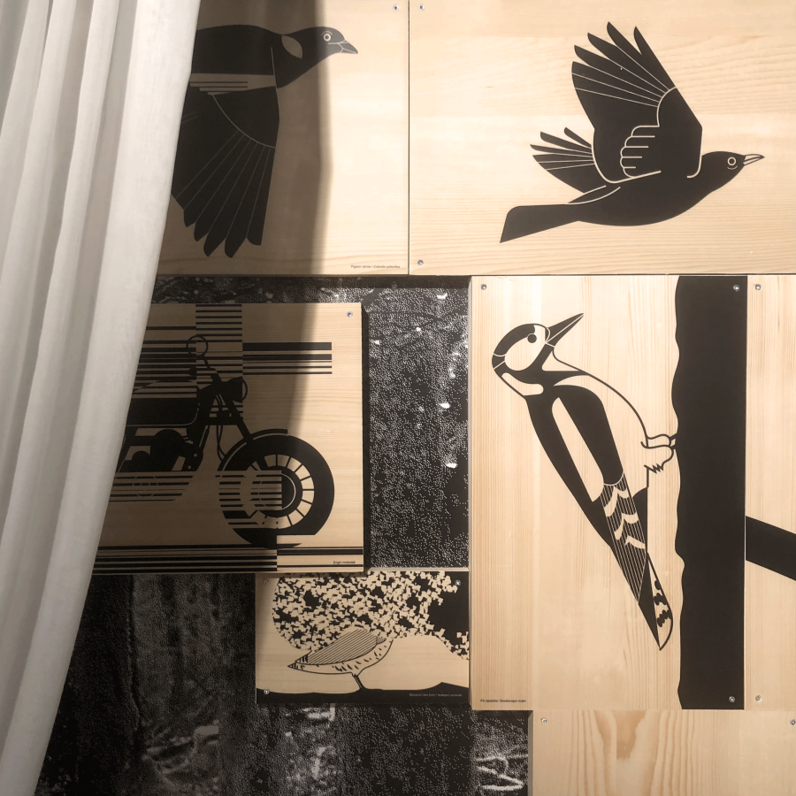 Un gradin en bois local qui permet de s’installer à sa guise, d’une capacité de 30 personnes assises, est conçu en rappelant les formes des ondes sonores. Les images sont traitées en noir et blanc, en associant photographies en bitmap et illustrations. La vidéo doit être un support visuel, qui doit laisser le son maître de l’immersion.