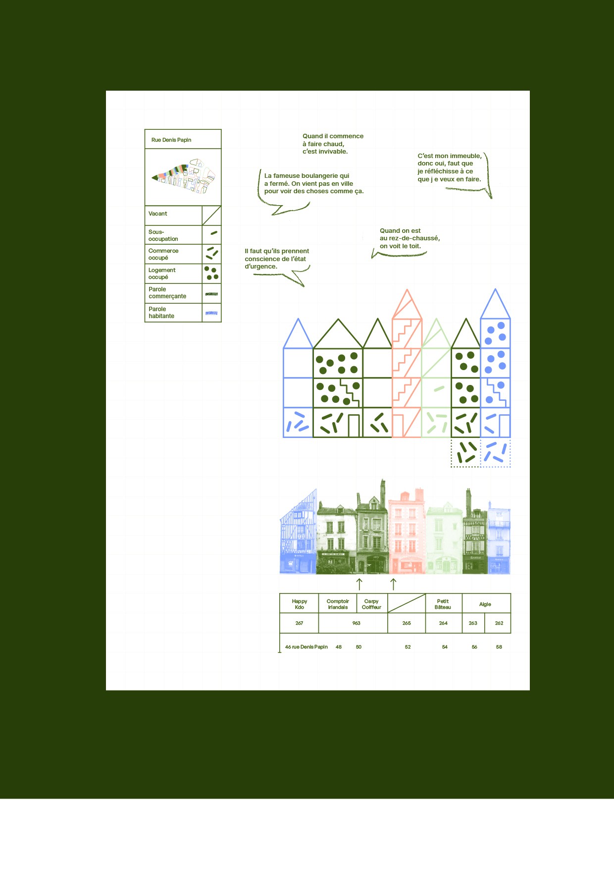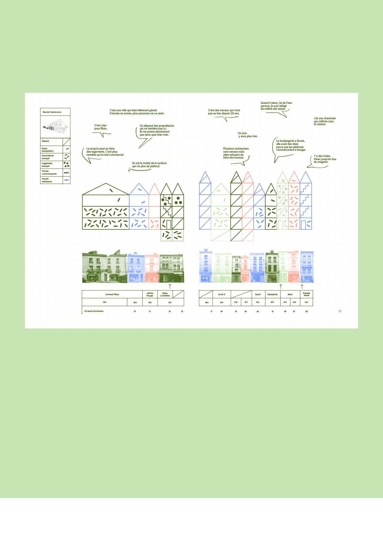 A Blois, comme dans de nombreuses villes françaises, une problématique urbaine ronge le cœur de ville : la sous-occupation, allant jusqu’à la vacance. Multifactorielle, elle est le résultat cumulé d’une évolution des modes de consommation et de vie : les rues commerçantes se vident au profit des centres commerciaux périphériques, où les grandes enseignes se déportent. Le centre historique voit ses rez-de-chaussée occupés par des cellules commerciales au modèle économique fragilisé par une baisse de fréquentation, tandis que les étages – rendus inaccessibles par l’aménagement des cellules commerciales actuelles, restent, pour la grande majorité, vidés de leurs habitants. Le centre se dévitalise tant structurellement que sur le plan social et économique.