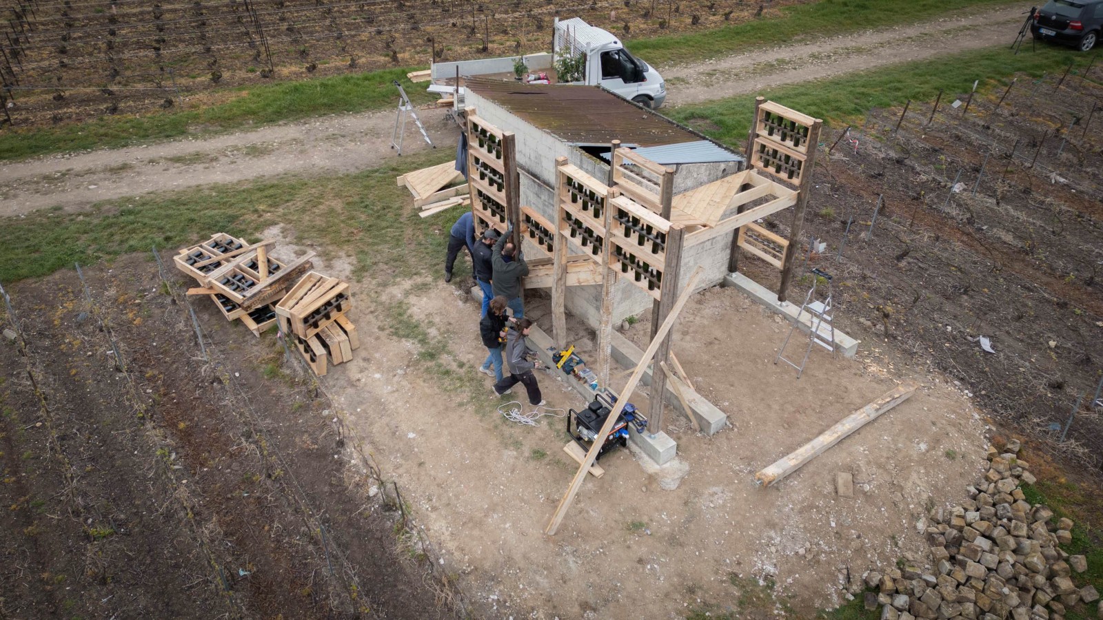 Pendant 14 jours, les 17 participant·e·s conçoivent et construisent cinq loges réalisées à partir des matériaux de réemploi, fournis par chacun des vignerons, implantées dans les vignes.