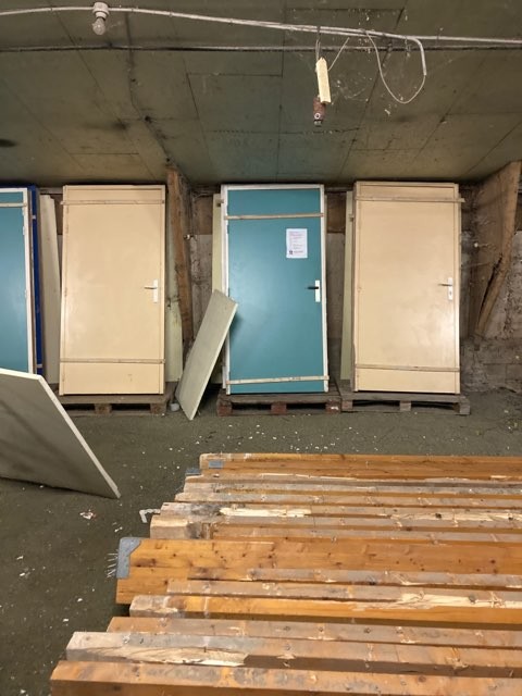 De part et d’autre sont desservis les espaces utiles à la vie quotidienne : la cuisine et ses réserves d’un côté, les bureaux de l’autre. L’ensemble des portes intérieures proviennent d’un chantier de déconstruction d’Angers, le même qui a permis de récupérer tous les chemins de câbles qui traversent le bâtiment en restant visibles.