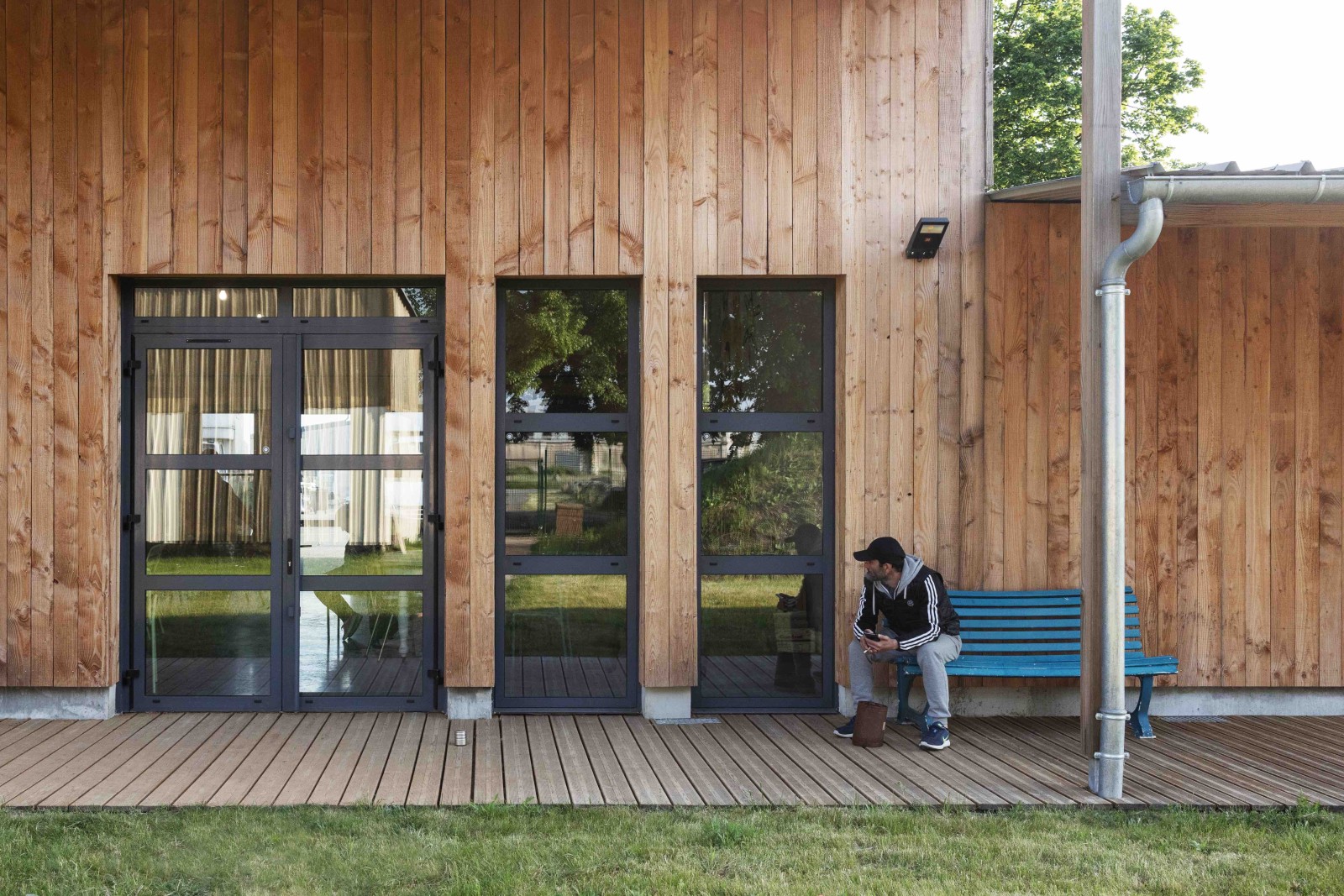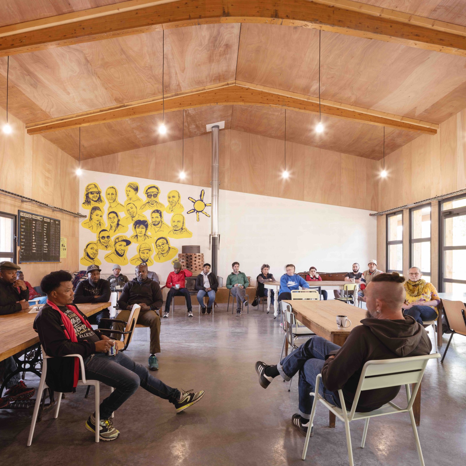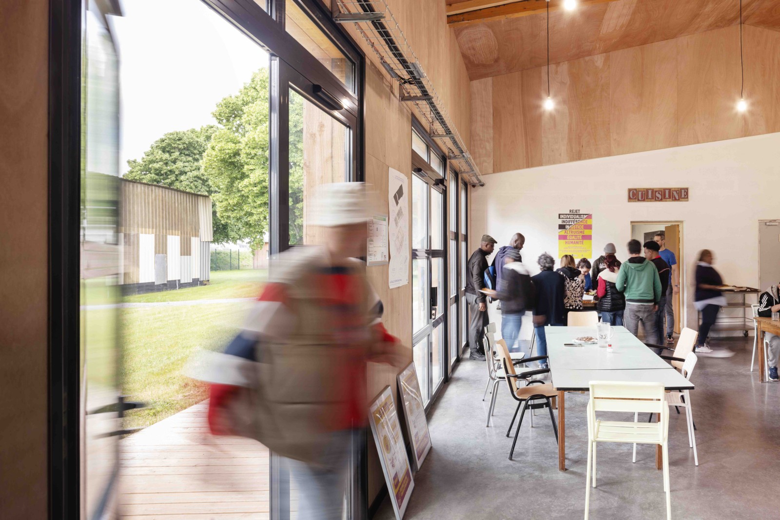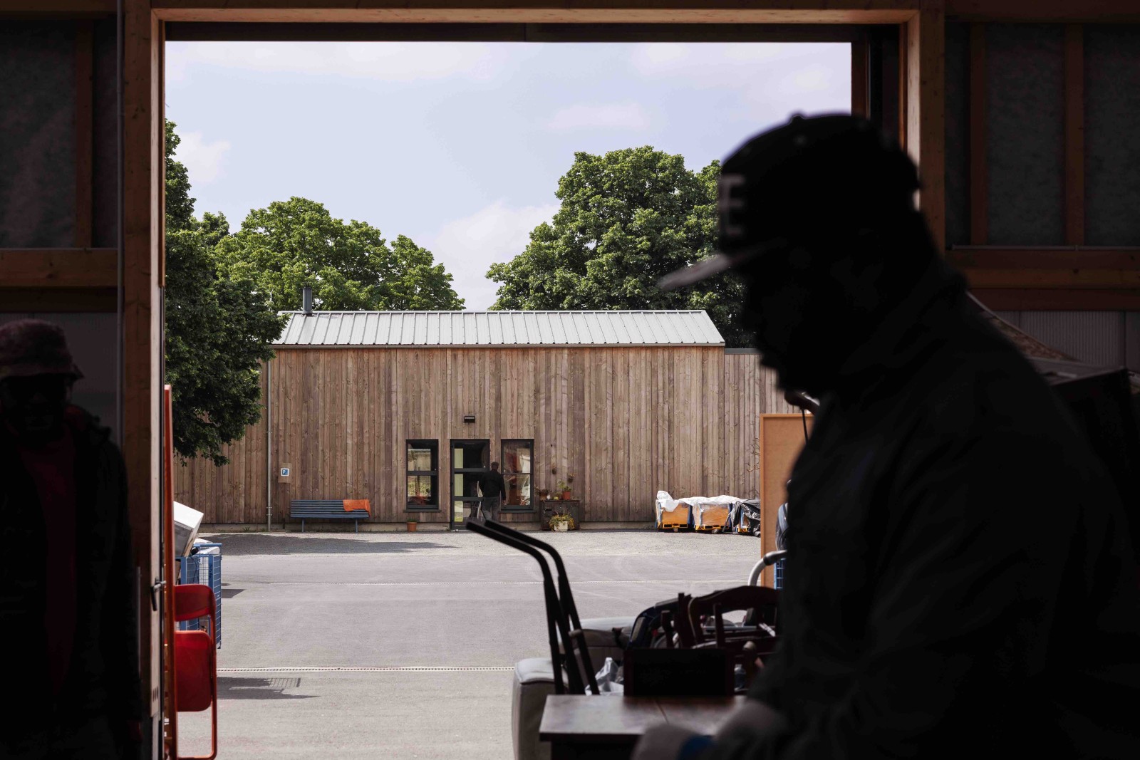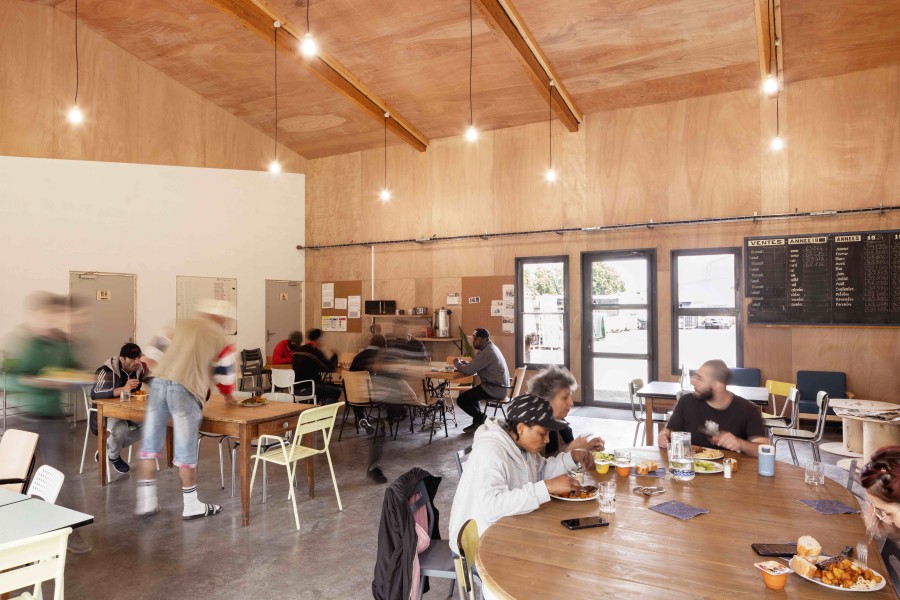 Le dessin de la salle communautaire s’en voit complètement imprégné : les ressources récupérées guident sa volumétrie et sa matérialité. Entre la cour des matériaux, lieu de livraison et de manutention, et la cour des compagnons, espace extérieur de repos, la salle communautaire s’implante et créée le lien autant qu’elle permet l’intimité.
