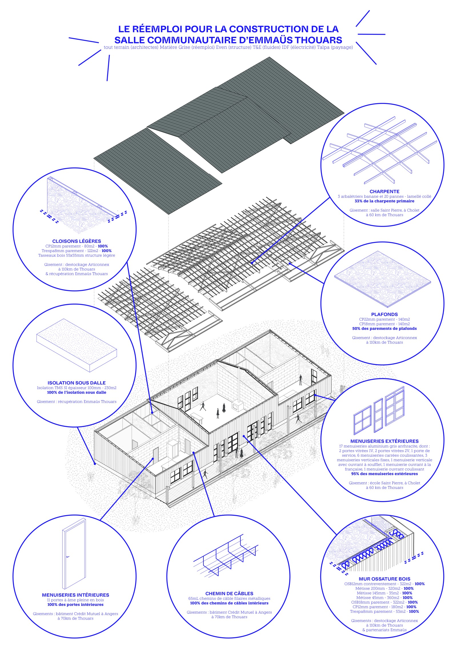 Pour la salle communautaire, tout terrain propose une démarche de réemploi des matériaux : identifier des gisements sur des chantiers de déconstruction de la région, les analyser selon leurs dimensions, leur état, leur capacité à être reposés, les sélectionner, les transporter, les stocker… Une chaîne de conception et de décision se met en place en lien étroit avec Émilie : de l’association Matière Grise, spécialisée dans le réemploi, Thierry, Éric, Loïc, Mathieu : les bureaux techniques du groupement de maîtrise d’œuvre, et l’équipe d’Emmaüs.