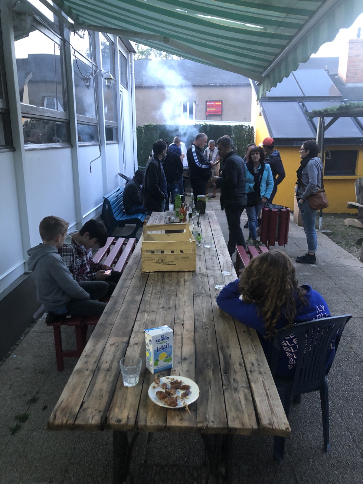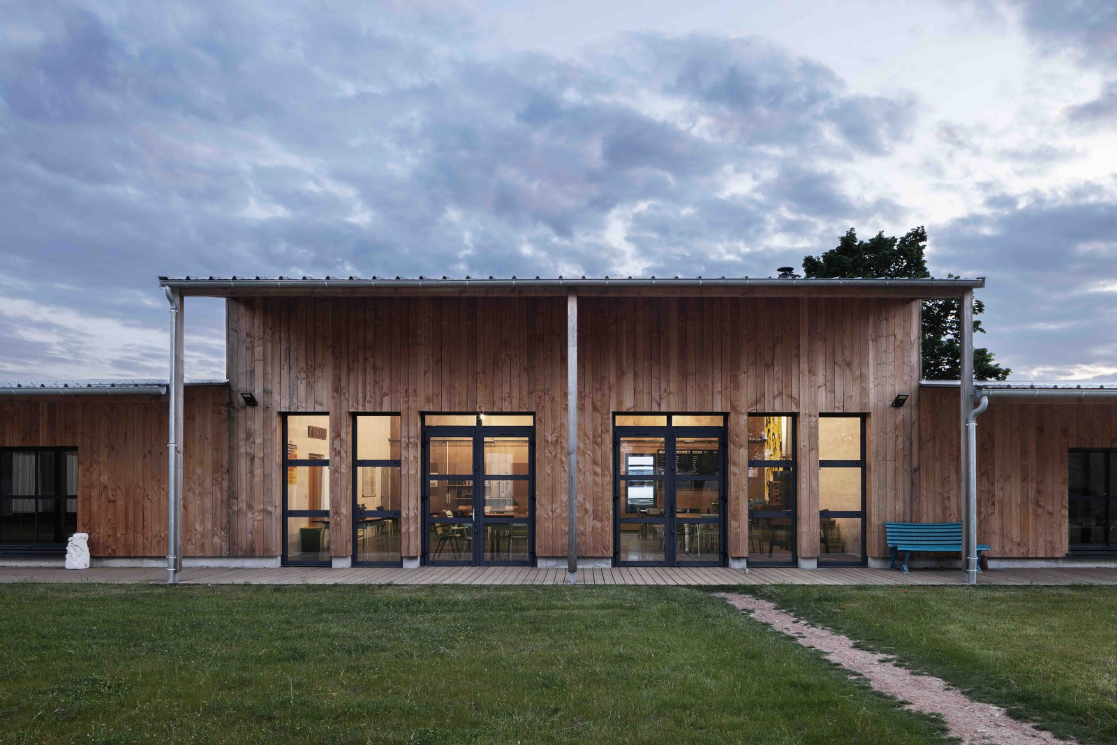 Les grandes baies en aluminium, récupérées dans une salle polyvalente à Cholet, inondent la pièce commune de lumière naturelle et laisse passer le regard d’une cour à l’autre. La charpente en lamellé collé récupérée dans cette même salle polyvalente offre un volume généreux à la pièce.